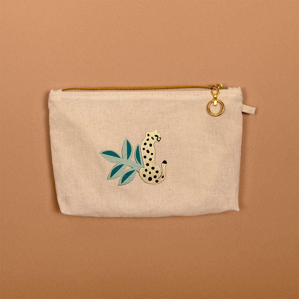 Cosmetiquera en lienzo color crudo, con aplique en tela de colores. Ideal para llevar a todas partes, para guardar maquillaje, cables, y demás artículos de uso personal. Cierre con cremallera.
