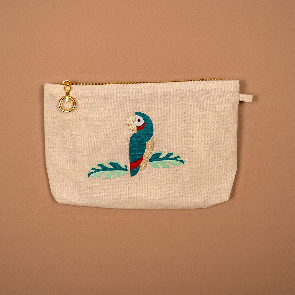 Cosmetiquera en lienzo color crudo, con aplique en tela de colores. Ideal para llevar a todas partes, para guardar maquillaje, cables, y demás artículos de uso personal. Cierre con cremallera.