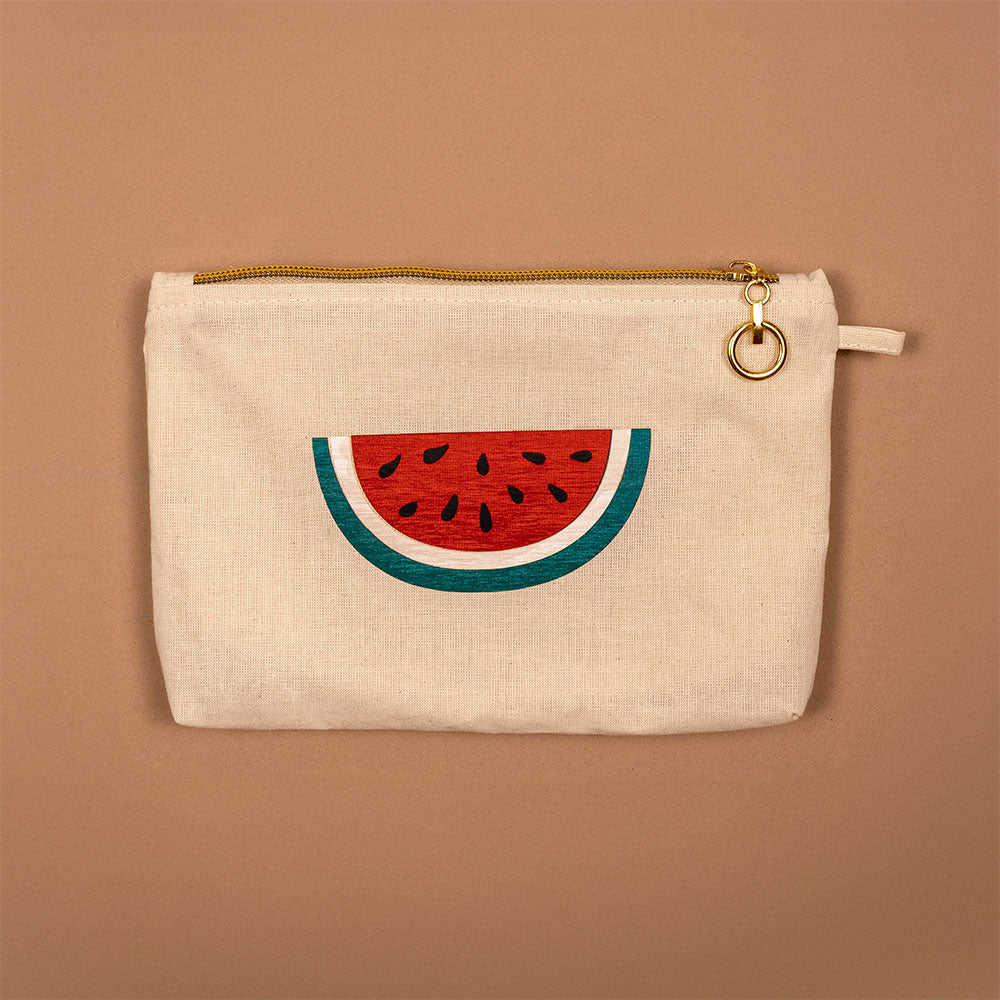 Cosmetiquera en lienzo color crudo, con aplique en tela de colores. Ideal para llevar a todas partes, para guardar maquillaje, cables, y demás artículos de uso personal. Cierre con cremallera.