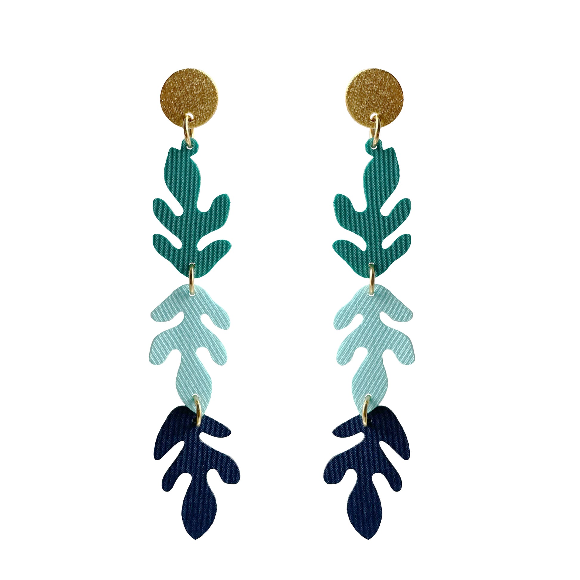 Aretes largos con tres hojas de diferentes tonos de verde.
